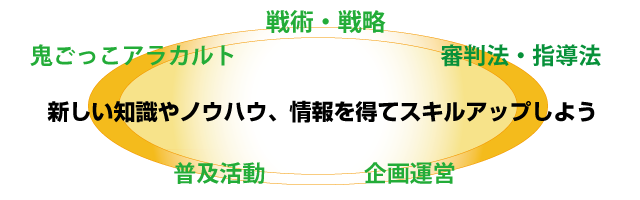鬼ごっこ協会では、公認指導員・審判員ライセンスを取得された方や、スポーツ鬼ごっこや各種鬼ごっこのスキル向上に努めたい選手や一般の方を対象にしてスキルアップを目指した研修会を開催しております。新たな知識やノウハウ、情報を得ることで、日頃の活動の更なる一助となればと思っております。毎回テーマを決めて、定期的に開催をしています。